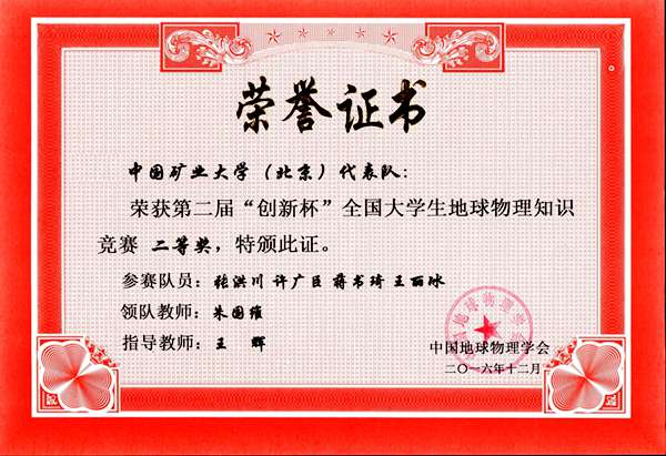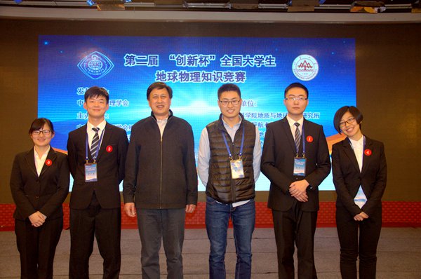2016年12月10日,由中国地球物理学会主办、山东大学承办的第二届“创新杯”全国大学生地球物理知识竞赛在济南举行。我院地球物理学专业2013级本科生张洪川、许广臣、蒋书琦和王丽冰组成的“越崎队”代表学校参加竞赛,与兄弟院校本科生、研究生同台竞技,经过紧张而激烈的角逐,“越崎队”在本次比赛中获二等奖的好成绩。