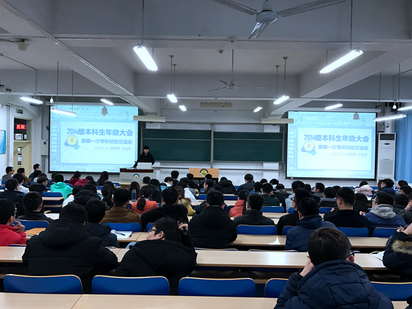 2017年2月21日下午,我院在教学楼107召开2014级本科生年级大会暨第一次考研经验交流会。院团委书记乔志勇、考研成绩优异的2017届本科毕业生以及2014级全体本科生参加会议。会议由辅导员王尧葵主持。
