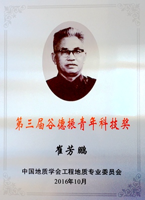 日前,中国地质学会工程地质专业委员会公布了第三届“谷德振青年科技奖”获奖名单,共10人获奖,我院教师崔芳鹏名列其中。