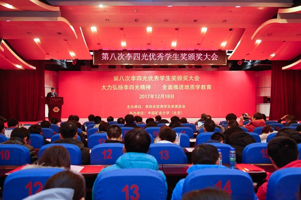 12月18日下午,第八次李四光优秀学生奖颁奖大会在中国矿业大学(北京)举行。国务院参事、国土资源部原总工程师、李四光地质科学奖基金会理事长张洪涛、原国土资源部科技与国际合作司司长姜建军、原李四光地质科学奖委员会秘书长王泽九、教育部科学技术司司长雷朝滋、中国地质调查局原党组成员、中国地质科学院原党委书记、副院长、李四光地质科学奖委员会秘书长王小烈、中国工程院能源与矿业学部主任彭苏萍院士、中国矿业大学(北京)校长杨仁树、中国地质大学(北京)副校长刘大锰、中国石油大学(北京)副书记、副校长韩尚峰、北京大学教务部副部长刘建波、北京大学地球与空间科学学院名誉院长潘懋等嘉宾出席颁奖大会。24位获奖学生和900多名地质专业学生代表参加了颁奖大会。大会由中国矿业大学(北京)党委副书记王忠强主持。