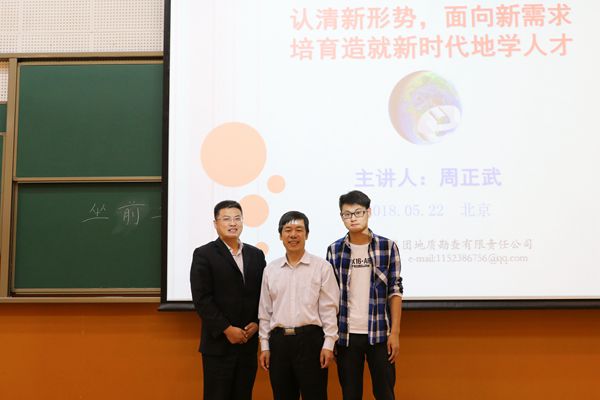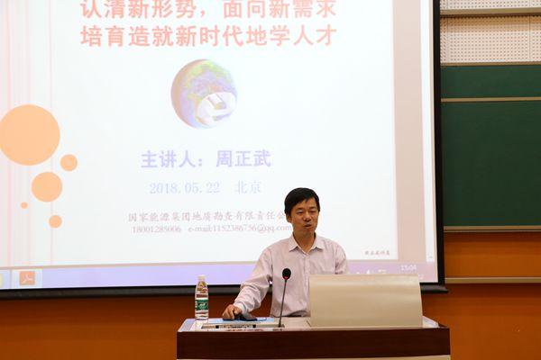 周正武老师主要就地质勘查形势回顾与展望、我国地质人才现状、新时代地学人才培养、未来学生研究领域与发展前沿四方面作了深入、精彩的报告。在报告中,他介绍了地质勘查行业的发展形势并提出了地质工作的新需求;同时就我国地质人才现状进行分析并指出许多重要领域急缺地学人才的现状;随后就新时代地学人才培养模式进行介绍,要努力培养出专业面广,产学研相结合,具备复合型知识、复合型能力的知识复合型人才;最后就未来学生研究领域与发展前沿进行了深入专业的介绍。会后与学生进行了提问互动,周正武老师一一认真地解答了学生所提出的问题与疑问。