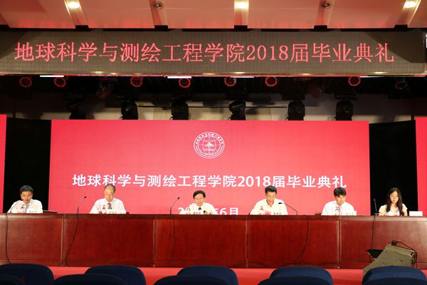 6月23日上午,地球科学与测绘工程学院2018届毕业典礼在科技会堂报告厅举行。学院学位委员会主任、院长唐跃刚,学院学位委员会委员、副院长邵龙义、程久龙、李晶,党委副书记杨向东出席典礼。此外,毕业班班主任代表蒋金豹,毕业生家长代表吕跟萍,各系教师、辅导员、全体毕业生及其亲友也受邀参加毕业典礼。典礼由院党委副书记杨向东主持。