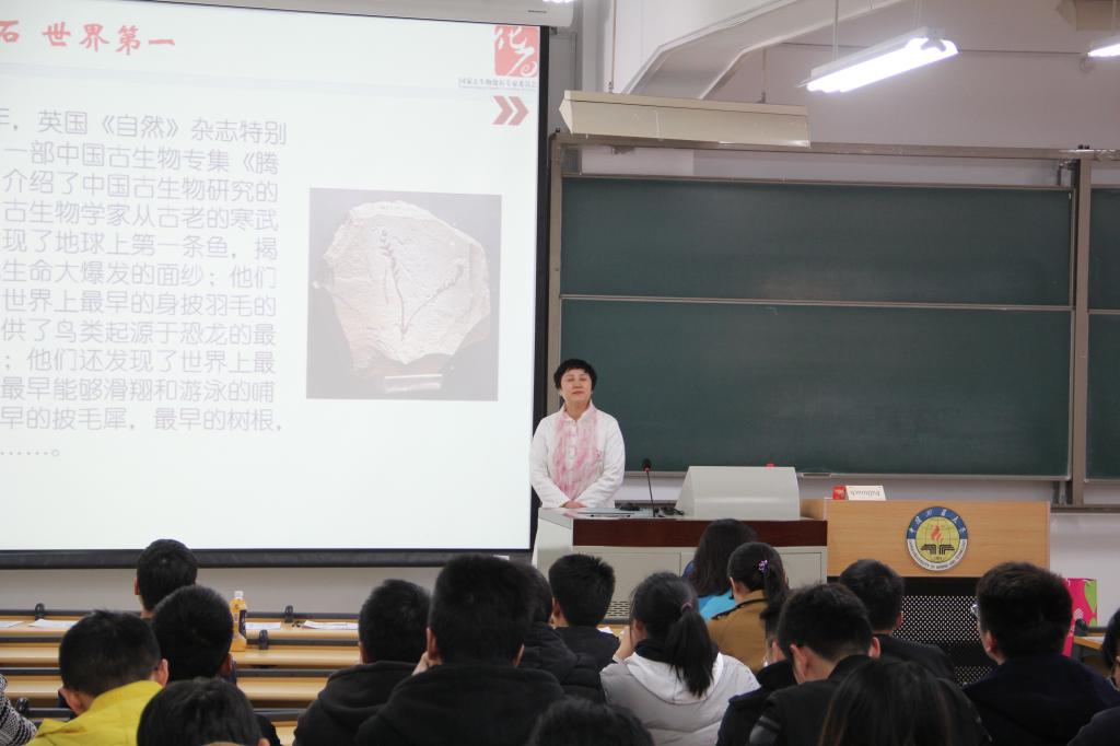 化石是研究生命起源与进化的重要载体,化石是文化,需要在保护中弘扬传承。王丽霞深情地讲述了自己与化石的渊源和为弘扬化石文化所做的努力。无论是夏日里骄阳似火的湖北,还是冬季零下三十度的黑龙江畔,凡有化石产出的地方,就有王主任的足迹。建设化石村、建立古生物博物馆、创建“互联网+化石保护行动计划”、追索流失海外化石等,王丽霞结合其二十多年化石工作经历,向同学们强调:“保护珍贵化石,讲好化石故事;加强化石保护研究,助力生态文明建设;弘扬化石文化,促进新时代发展”。