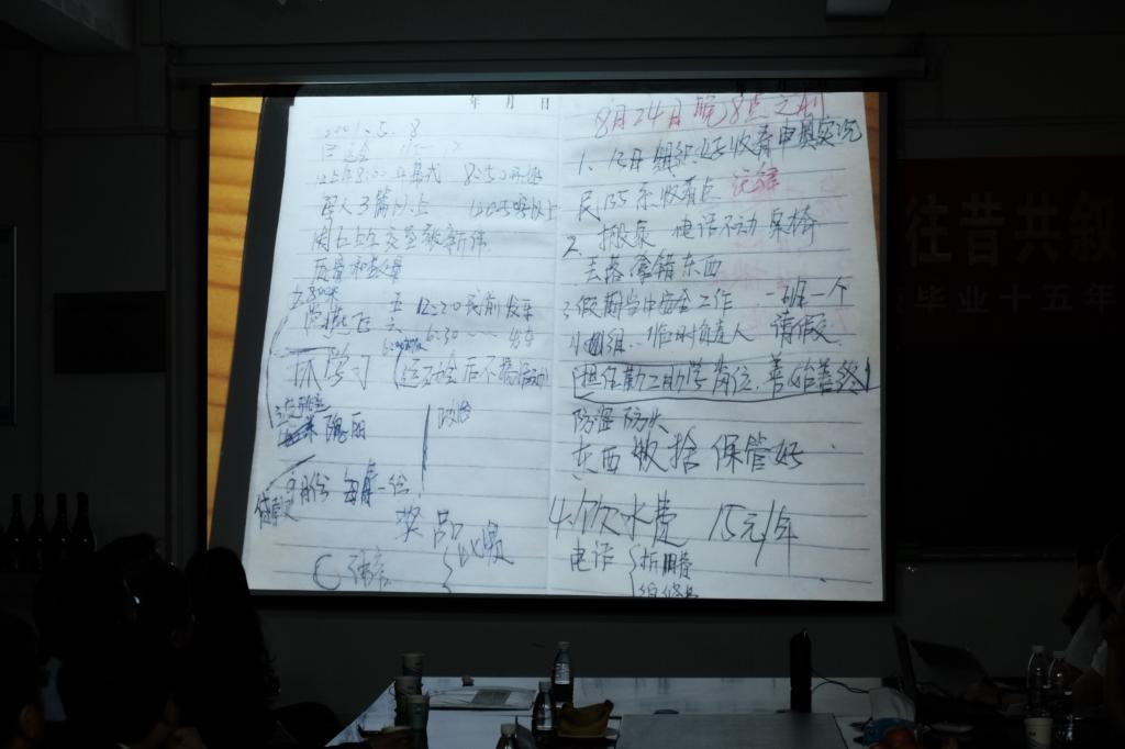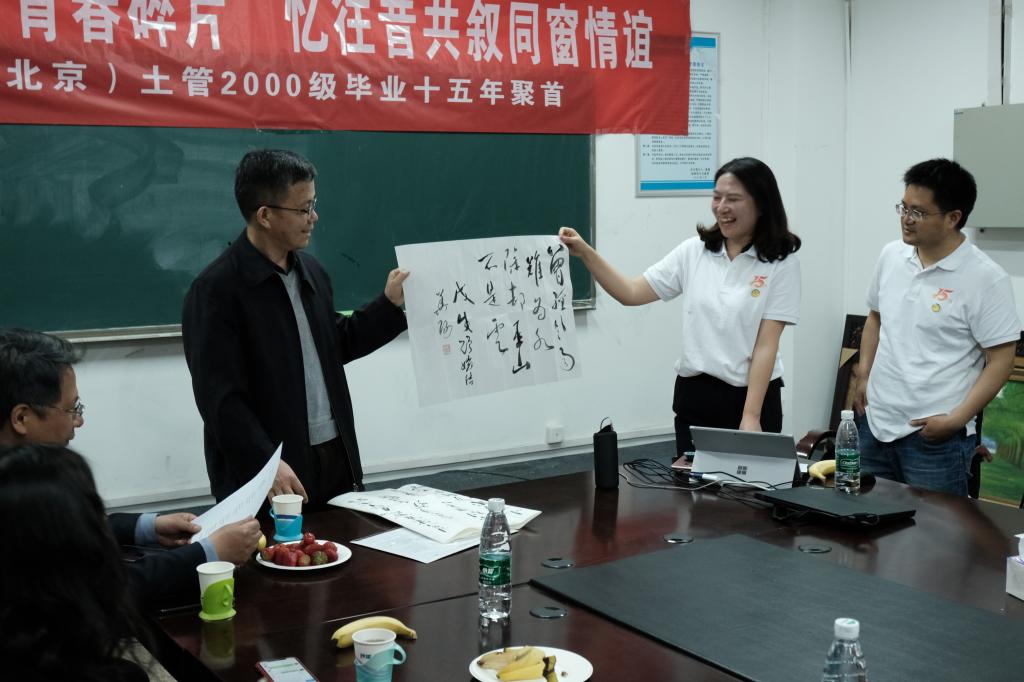 辅导员安宇回顾与同学们朝夕相处的四年情景,点点滴滴,历历在目,对同学们今日之成就倍感欣慰,希望大家的事业能更上一层楼。班主任赵学胜、毕银丽回忆往昔,感慨万千,为同学们感到骄傲,对同学们表达了美好的祝愿。胡振琪深情回忆学科建设时的场景:00级是土地资源管理专业本科招生的第一批学生,学院老师将学生们视如己出,如今学生已成为行业中的中坚、骨干,老师为同学们感到骄傲。李晶、杨可明、袁德宝、彭小沾、程琳琳、徐春光等与同学们共同回忆美好过往,希望同学们常聚常叙,祝愿同学们生活美满、事业有成。戴华阳老师虽未能到场,但他为同学们送上了自己专门题写的书法作品:“曾经沧海难为水,除却巫山不是云”,不仅学生们未曾忘记似海师恩,老师又何尝忘记过自己最亲爱的学生们呢。