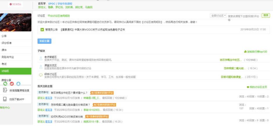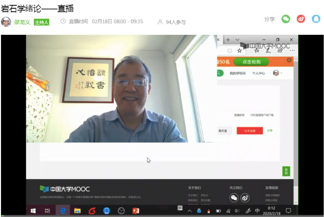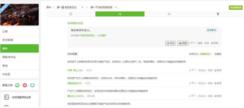 学生们在SPOC课程中积极回答老师提出的问题,并且针对自己不理解的问题也大胆交流讨论。第一章课程上线以来,取得了很好的线上教学效果。为了提高学生的学习效率,团队在《岩石学》SPOC课程中尝试添加直播授课。直播之前,建立了岩石学课程微信群,提前通知直播时间。授课老师根据对课程内容及授课对象的多年体会,精选出课程内容的关键知识点,恰到好处地呈现出课程的精华内容。直播过程中学生可以手机和电脑并用,电脑用来学习直播课程,手机用来反馈问题。第一堂《岩石学》直播课程已经顺利完成,并且收到了很好的学生反响。后续课程团队还将持续更新视频课程,及时与同学进行线上讨论交流,针对同学们的反馈,不断改进工作。
