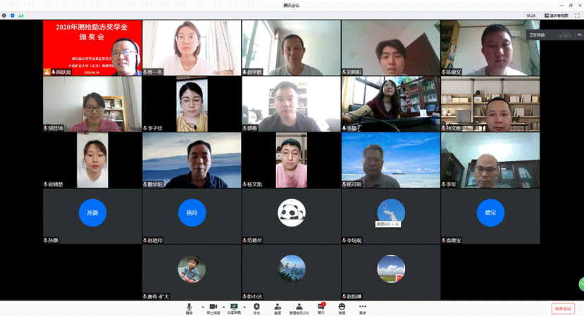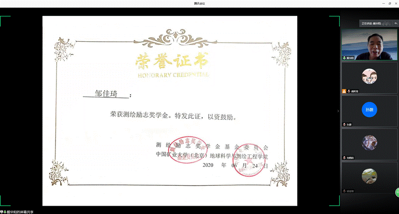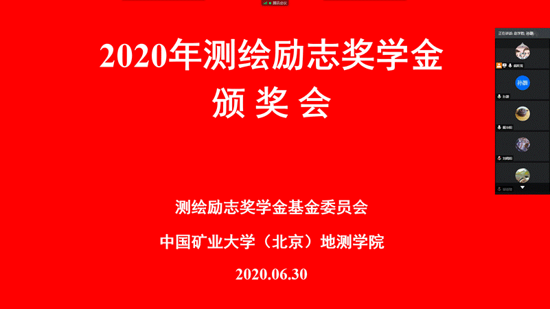 2020年6月30日下午,学院首次采用线上颁奖的形式召开了第七届测绘励志奖学金颁奖会。学院党委书记李晶、副院长李军、测绘与土地利用系戴华阳、袁德宝、赵艳玲、程琳琳、阎跃观、李培现,遥感与地理信息系赵学胜、杨可明、孙文彬、许志华、孙灏、赵恒谦,辅导员杨文凯等近20位老师出席了会议。第七届测绘励志奖学金获奖学生邹佳琦、陈俊义、佟一冬、李子佳、侯翘楚、刘欧阳参加了颁奖会。