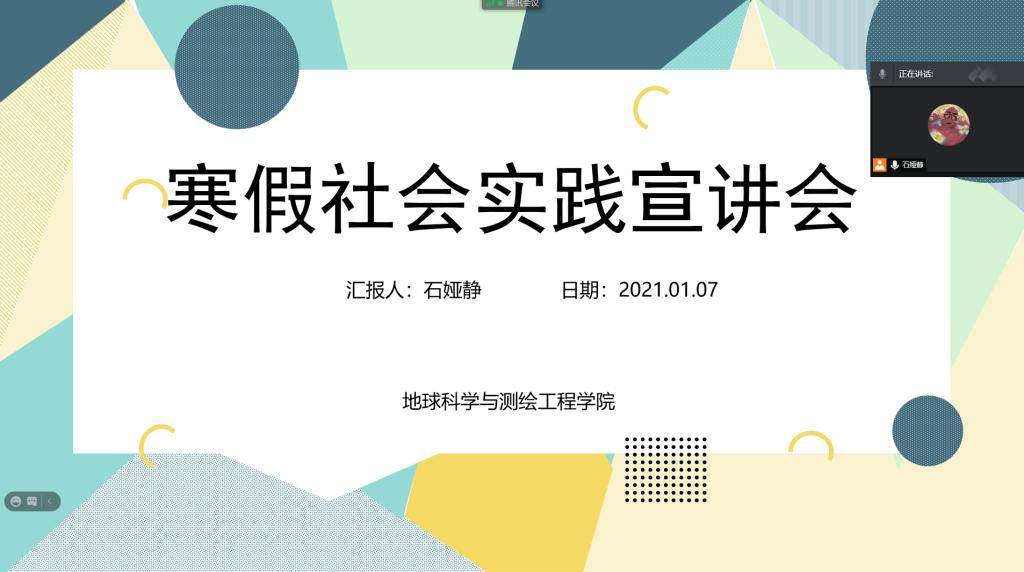 1月7日19点30分,地测学院召开了2021年寒假社会实践宣讲会,会议由学院团委社会实践部负责人石娅静主持,学院团委书记陆雪松、2020级辅导员毕涵喆、2020级全体学生以及2019级各班班长、团支书参加会议。