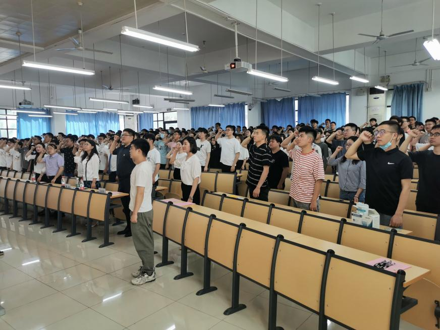 2021年 6月21日上午10:00,地测学院新党员入党宣誓暨毕业生党员重温入党誓词大会于学院路校区教学楼210室召开。学院党委书记李晶,党委副书记王庆多,学工办主任徐春光,辅导员刘博秒、王志强与168位新发展党员及全体毕业生党员参加宣誓仪式。会议由学院党委专职组织员胡媛主持。