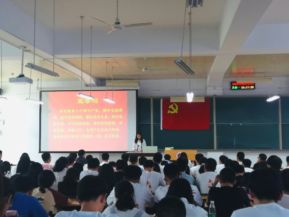 大会在庄严的国歌声中拉开帷幕。学院党委副书记王庆多宣读了地测学院168位新预备党员名单。辅导员王志强带领全体党员,面向党旗并庄严宣誓,举起的右手是肩负起的重担,口中的誓词是决心的见证,坚定的眼神是忠诚的彰显,誓词的每一个字都刻在了同学们心里,永不磨灭。