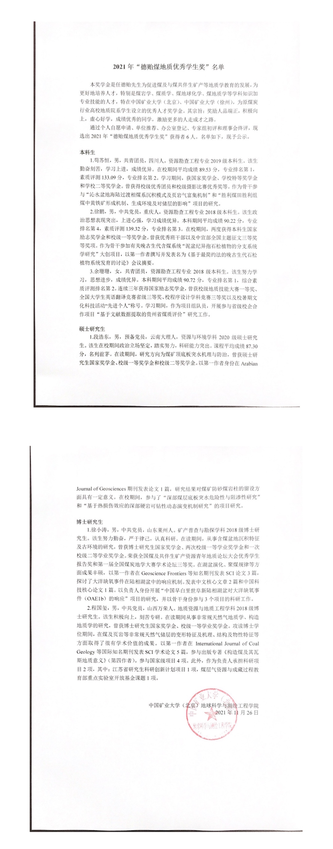 通过个人自愿申请、单位推荐、办公室登记、专家组初评和理事会终评,现选出2021年“德贻煤地质优秀学生奖”获得者6人。名单如下,现予公示。