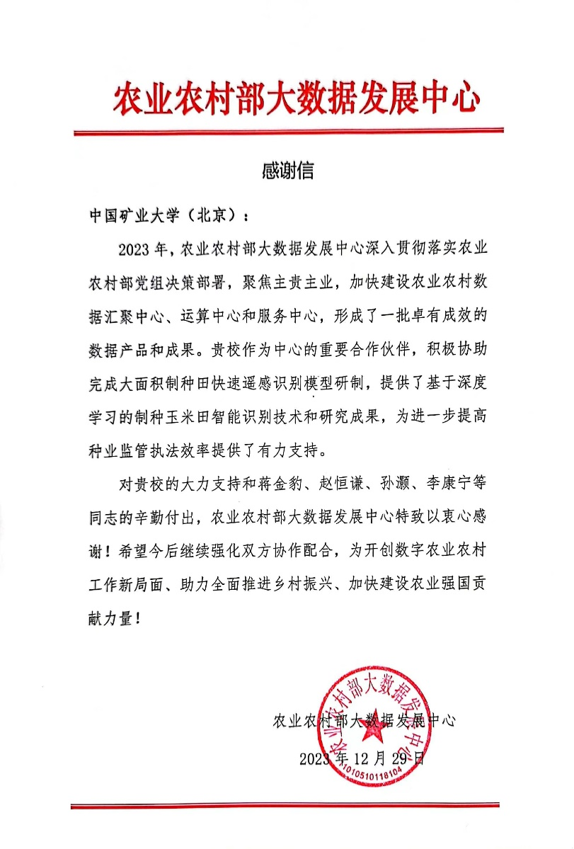 遥感应用新进展!农业农村部大数据发展中心向我校发来感谢信