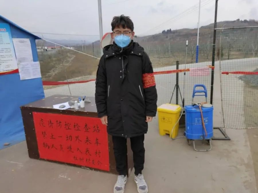 硕18-2班王玺是家乡疫情防控志愿者中的一员,他每天要协助村领导完成村口执勤任务,在四个路口设置关卡,严格控制住户外出和外来人员的流入;配合村领导完成巡逻任务,积极地宣传各项防护措施,提高村民的防护意识,切实落实各项工作。