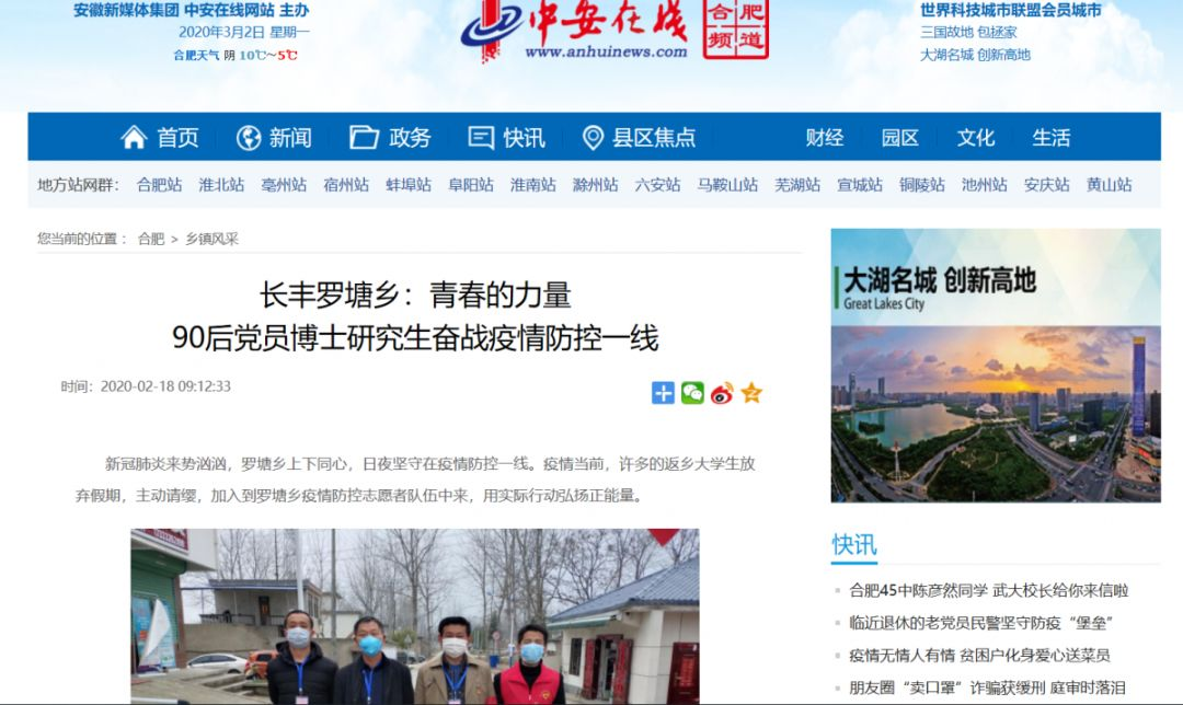 一句句暖心的话语每天都在卡口回响,温暖着往来每一位村民。安徽省新闻网中安在线以《青春的力量—90后党员博士研究生奋战疫情防控一线》为题报道了身穿“红马甲”日夜坚守在防控一线的“北矿学子”张劲满同学。