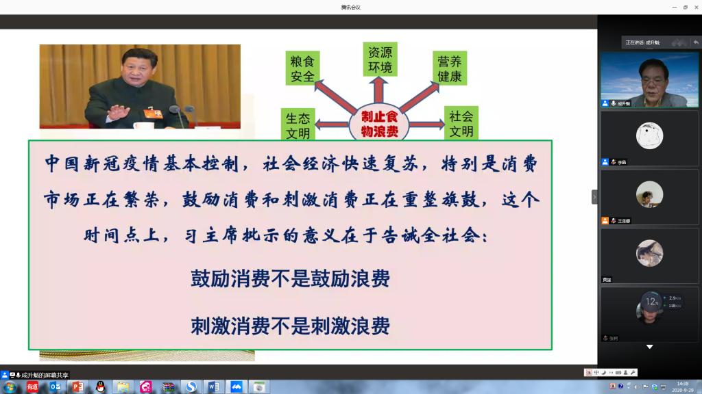在线聆听成升魁研究员的报告后,大家纷纷表示,将认真落实学校总体部署:将勤俭节约内化于心、外践于行,从珍惜一粒米、一度电做起,从每一餐的光盘行动开始;让厉行节约、反对浪费在全社会蔚然成风,用实际行动守护中华民族传统美德,守护国家粮食安全、资源环境协调、生态文明、社会安全和自身健康。米粒虽小,尤见利益廉耻;节约事微,可助兴国安邦。