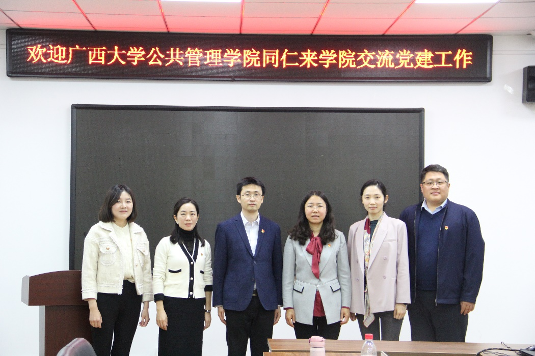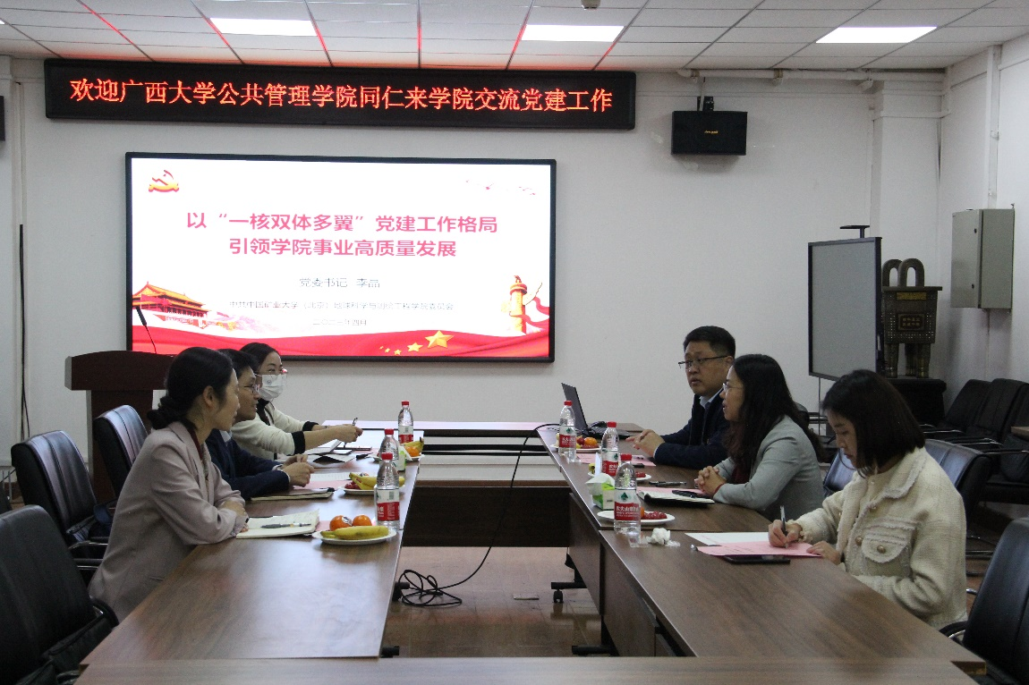 为深入贯彻落实新时代高校党建工作总要求,加强基层党组织建设经验交流,4月27日上午,广西大学公共管理学院党委书记聂鑫、党委副书记庞惠来我院交流学习,校党委组织部副部长李帅、学院党委书记李晶、学院党委副书记王庆多、专职组织员胡媛出席会议,会议由李晶书记主持。