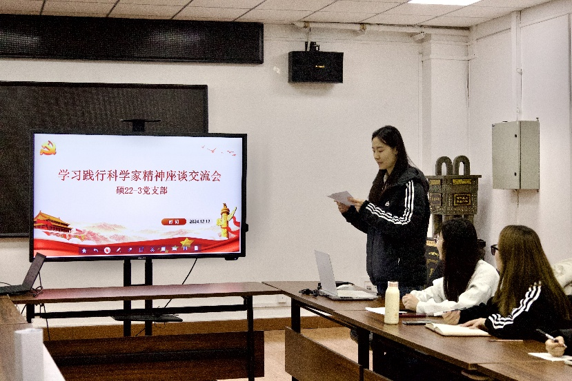 2024年12月12日下午,硕22-3党支部在综合楼249召开了学习践行科学家精神的集中讨论与交流座谈会,会议由党支部书记孙桤汶主持,学院党委书记李晶出席并讲话。