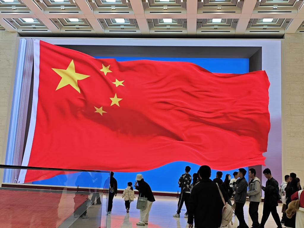 展览创新运用裸眼3D技术,在20米巨幕上动态呈现巨幅飘动国旗,磅礴的画面配合环绕声效,令师生仿佛置身红旗翻涌的壮美山河之间。多媒体展区还集中展示了100幅新时代国旗飘扬的高清影像,从雪域高原到南海岛礁,从航天器舱到国际赛场,全方位呈现“中国红”照耀全球的自信风采。