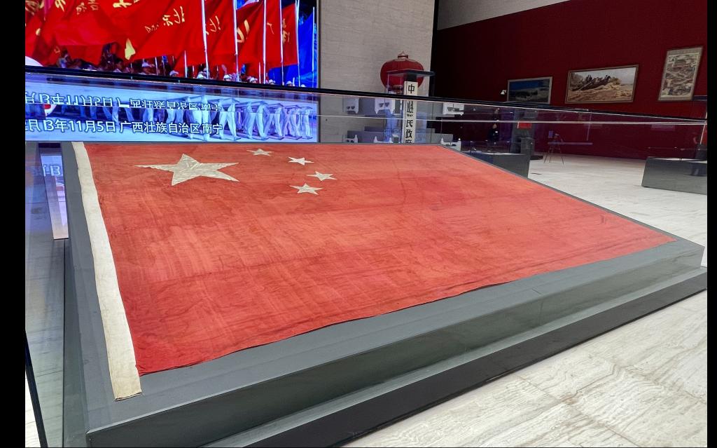 展览中,见证了新中国成立后多个重要历史瞬间的旗帜也颇为醒目。中国人民志愿军第54军130师388团1营1连指战员宣誓签名的国旗展现了新中国的国威与志愿军的军威;王继才和妻子王仕花坚守开山岛32年,每天升起的国旗上的一道道折痕,饱含着他们对祖国的浓浓深情;还有2005年搭乘“神舟”六号载人飞船飞抵南极点上空时展示的国旗,见证了我国航天技术日新月异的发展;编号为100的国旗曾在庆祝中国共产党成立100周年大会上飘扬在天安门广场,是展览中最“年轻”的文物,凝聚着全国人民和海外华人华侨对祖国繁荣的骄傲与自豪。