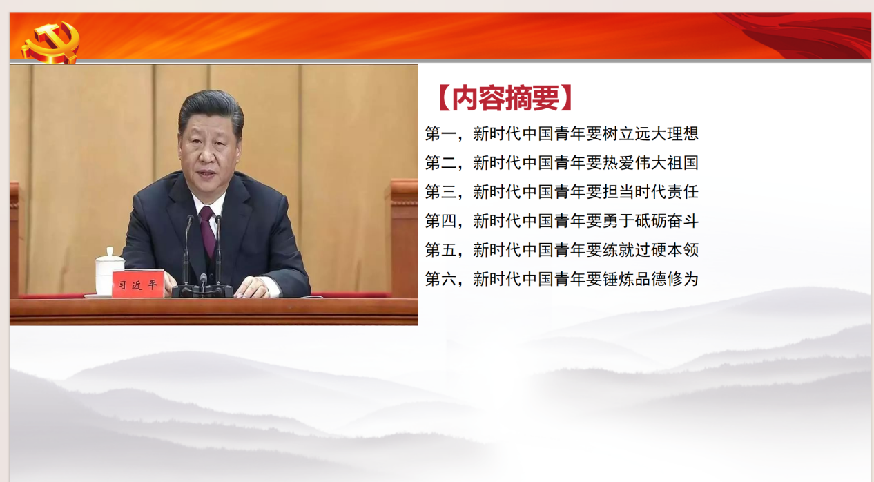 首先,刘奕涵带领同学们回顾了习近平总书记在今年五四青年节到来之际对青年提出的重要寄语。习近平指出,新时代新征程上,广大青年要继承和发扬五四精神,坚定不移听党话、跟党走,争做有理想、敢担当、能吃苦、肯奋斗的新时代好青年,在科技创新、乡村振兴、绿色发展、社会服务、卫国戍边等各领域各方面勇当排头兵和生力军,展现出自信自强、刚健有为的精神风貌;在推进强国建设、民族复兴伟业中展现青春作为、彰显青春风采、贡献青春力量,奋力书写为中国式现代化挺膺担当的青春篇章。同时,共青团要肩负起新时代新征程党赋予的使命任务,传承弘扬优良传统,团结凝聚广大青年为党和人民事业不懈奋斗。