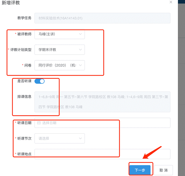 2. 选择计划类型、问卷,是否听课;若听课填写具体的听课时间、地点然后点击【下一步】