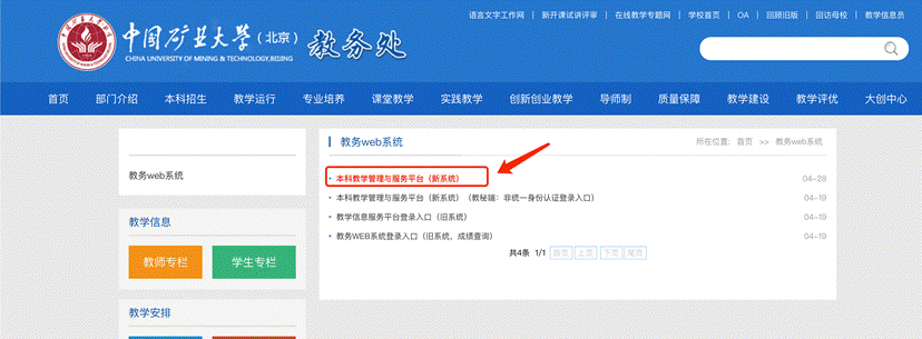 教务系统登录地址详见教务处网站链接【本科教学管理与服务平台】或者直接登录网址:http://jwxt.cumtb.edu.cn
