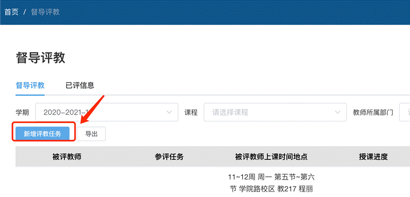 5. 非计划内评教:督导老师也可以选择其他教师的教学任务进行评教,点击【新增评教任务】