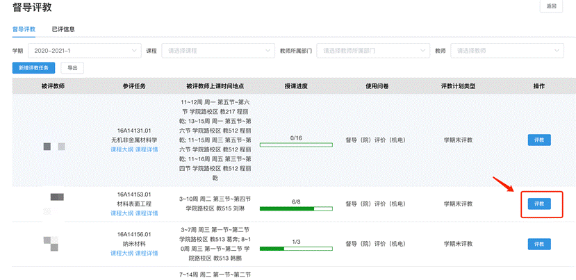 1. 点击【督导评教】图标,进入到督导评教页面,点击需要评教的任务后的【评教】按钮。